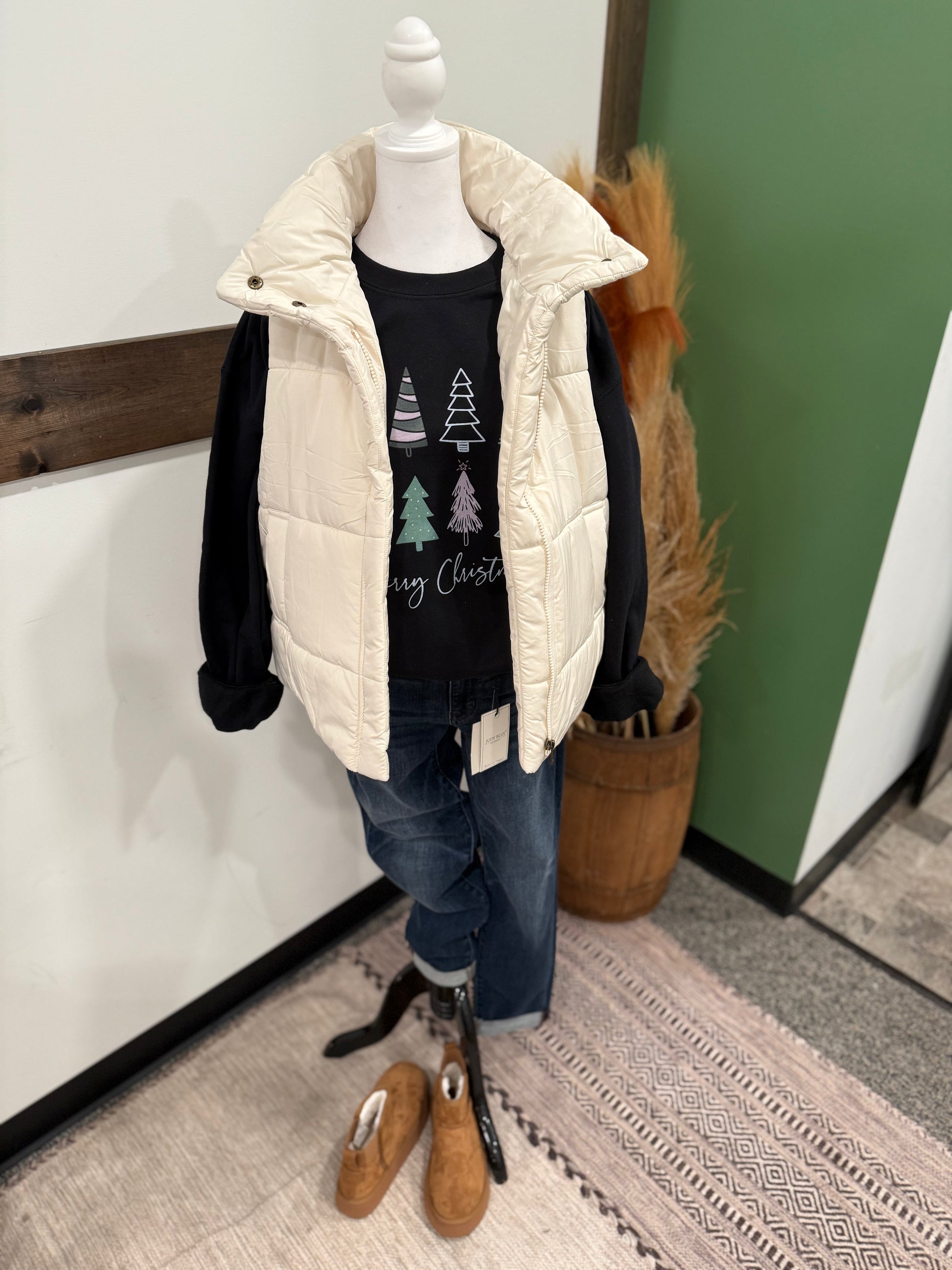Your new cold-weather essential. This cream puffer vest features a soft quilted design, a high stand collar for extra warmth, and a relaxed, easy-to-layer fit. Lightweight yet cozy, it’s perfect for tossing over long sleeves, flannels, or hoodies when you want that effortless, outdoorsy-chic look. A winter staple you’ll reach for again and again.