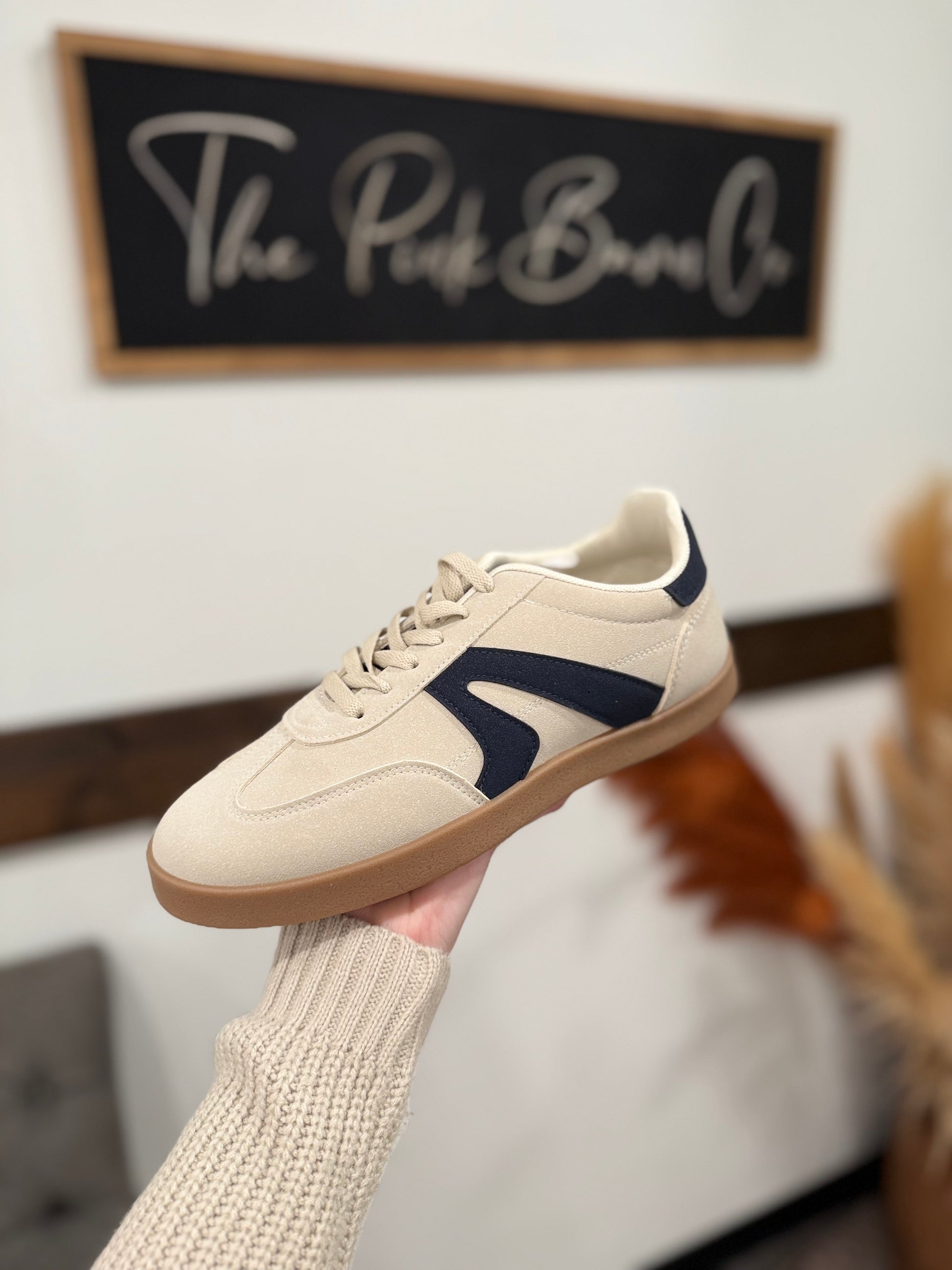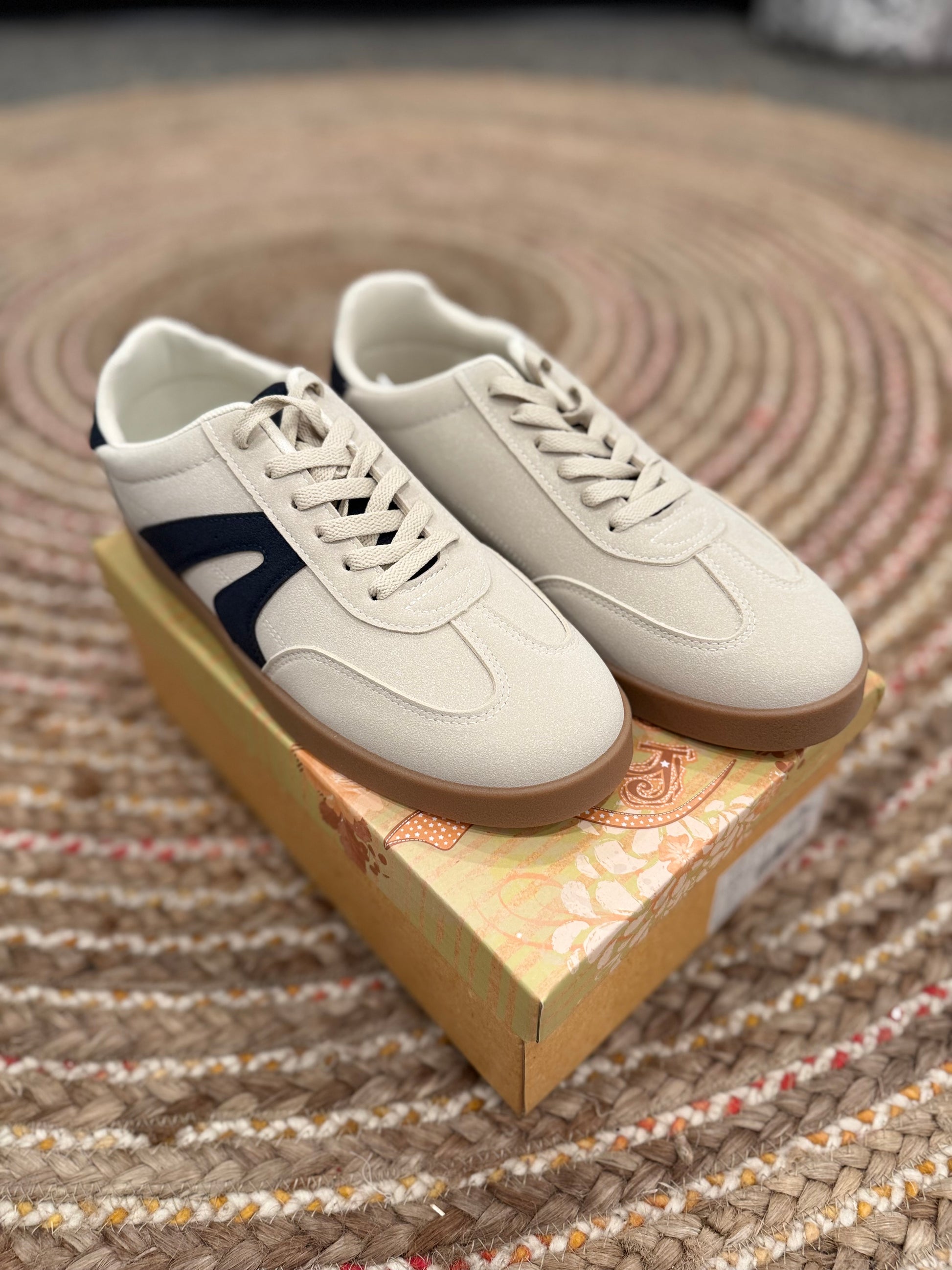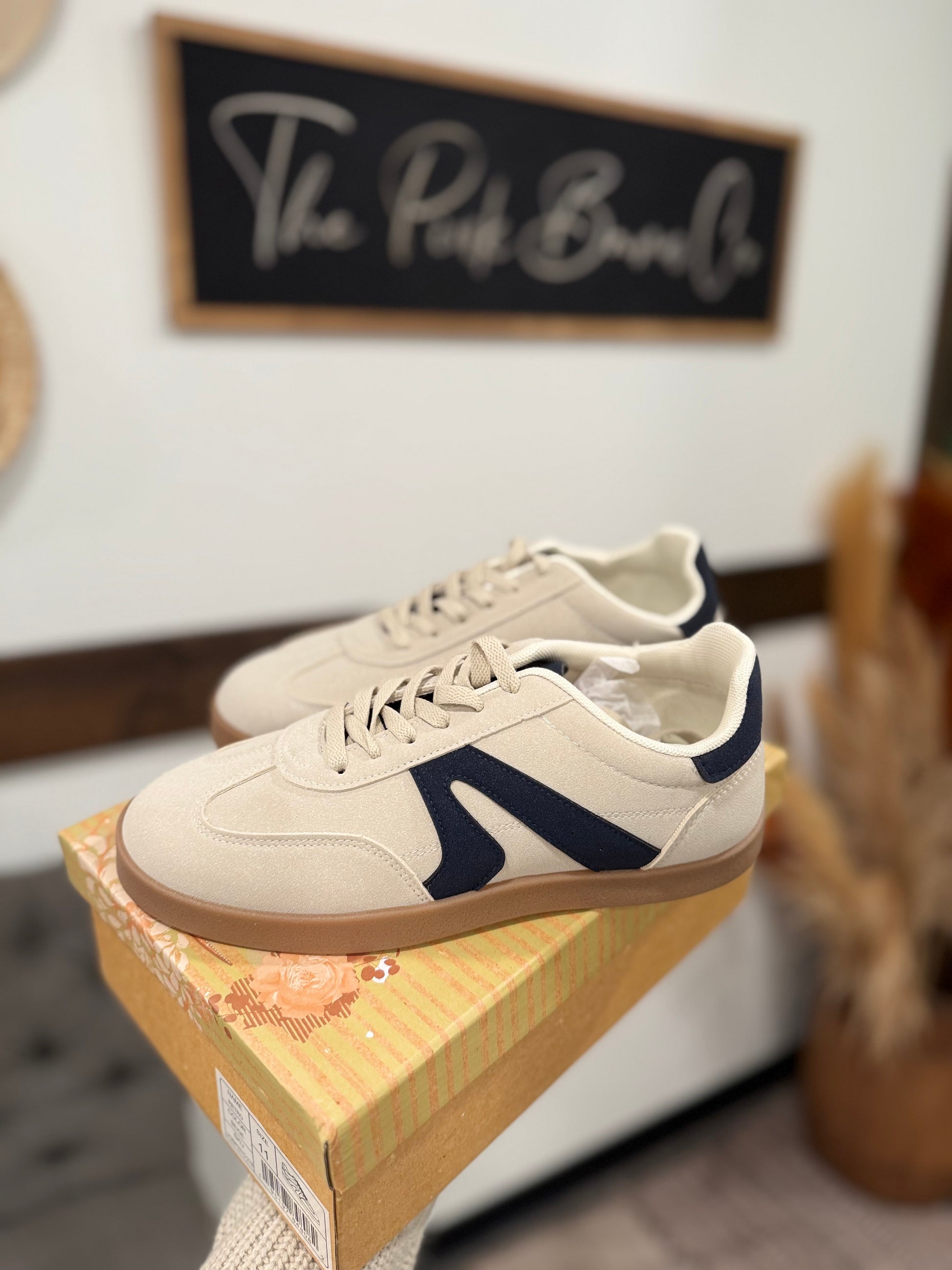 The Tretorn Rawlings sneakers feature a classic retro-inspired design, perfect for casual wear. They have a combination of canvas and suede in a light beige/tan color, a navy-blue suede Tretorn “wing” logo on the side, a durable gum rubber outsole that provides excellent traction and a vintage aesthetic, soft textile interior for all-day comfort, a blend of sporty and minimalist design, suitable for everyday outfits.